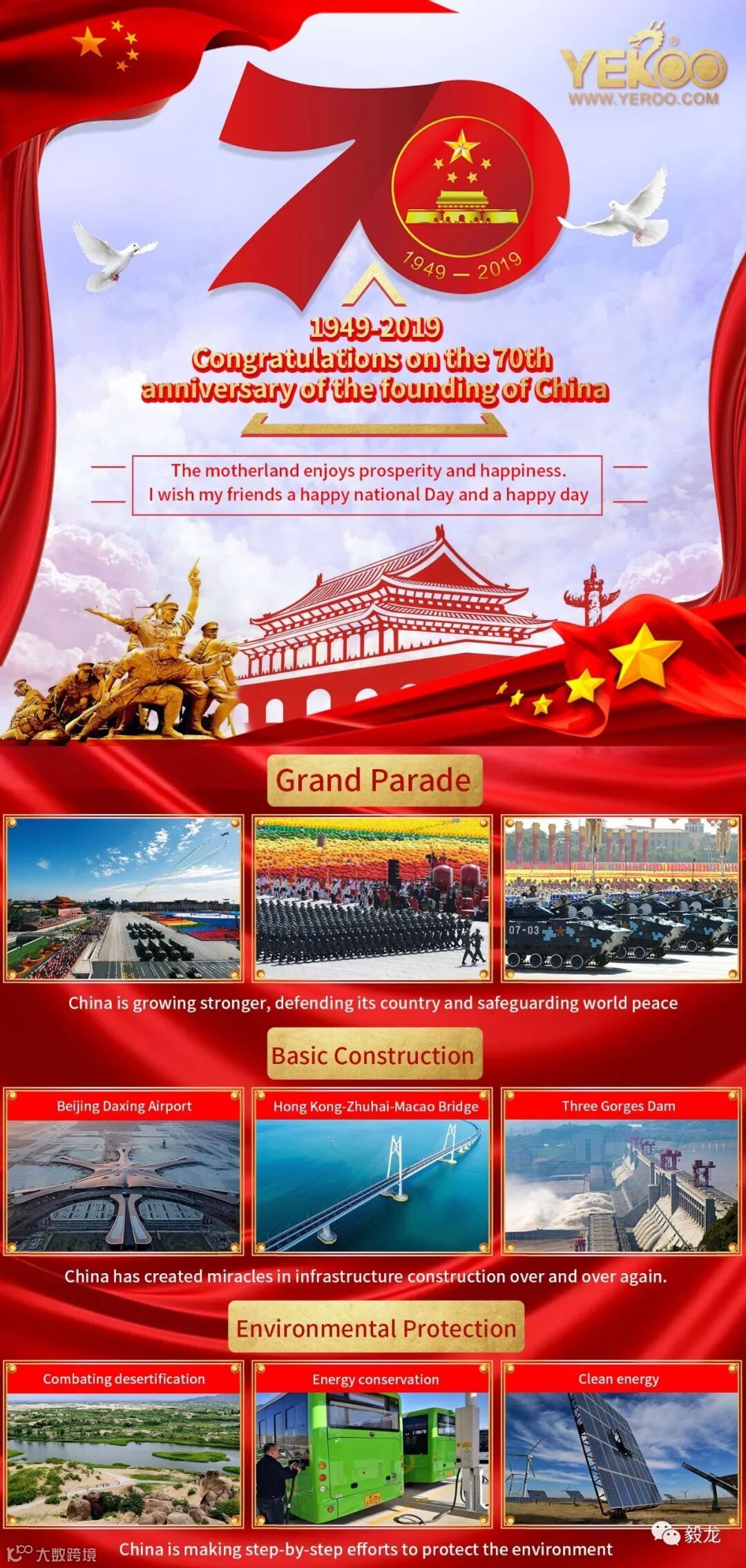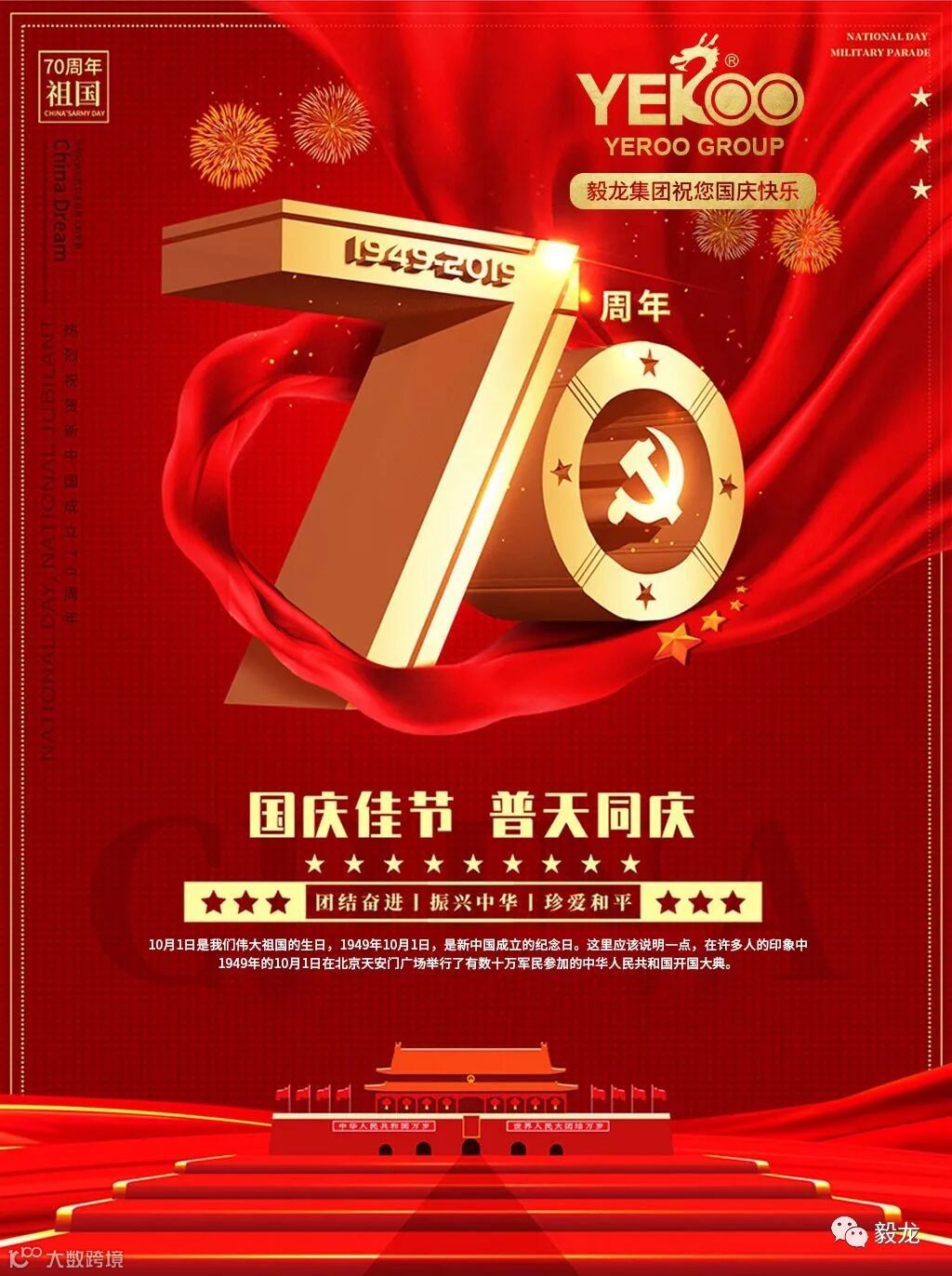 毅龙集团祝贺国庆节70周年华诞,让我们一起祝福祖国繁荣昌盛,越来越强。