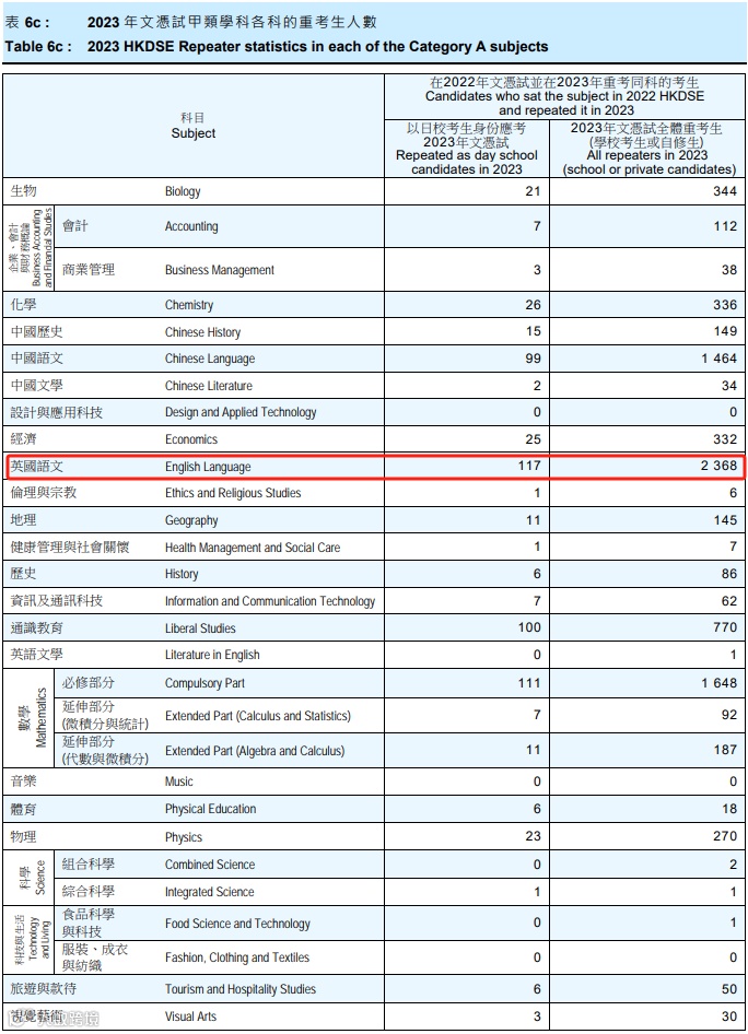 英文科最多人重考,中文科翻身率较高