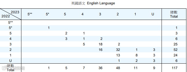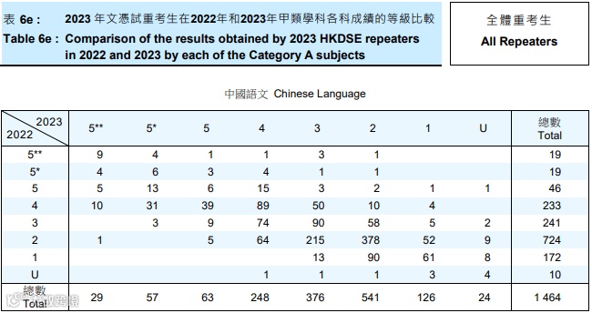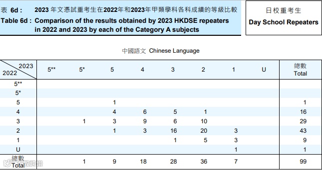 若只计算日校数字,今年有146人重考,重考后获得「33222」或以上成绩的有24人(16.8%),人数及比率都较2022年的32人(19.4%)下降。