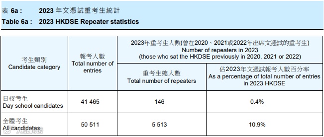 据香港考试及评核局公布数据,在今年的50,511名考生当中,有5,513人是重考生,占全体考生总人数的10.9%,其中161人(3.4%)在重考后获入读八大门槛「33222」或更佳成绩,人数和比率均较2022年的166人(4.0%)轻微下跌。