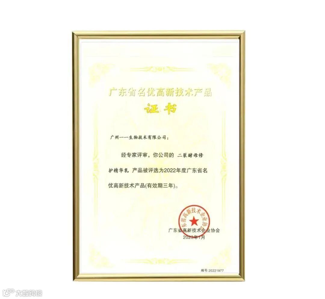 近日,广东省高新技术协会颁发了2022年广东省名优高新技术产品证书。凭借着突出的研发和创新能力、过硬的工艺技术水平,可靠的质量保证和良好的市场前景,广州一一生物“二裂酵母修护精华乳”产品被评选为2022年度广东省名优高新技术产品!特此喜报!再创佳绩!