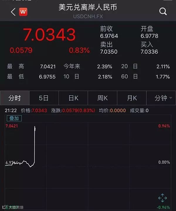8月5日,离岸人民币兑美元报7.0356,跌近600点破7元关口。在岸人民币兑美元随后也跌破7元。