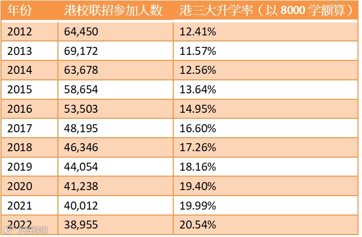 可以看到,港校联招的参加人数在过去10年间一直下跌,而港三大升学率一直上升。