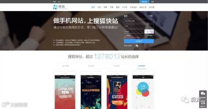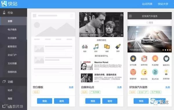 √ 除此之外,搜狐快站的功能也尤为强大,它融合了社区、电商、海报、公众号管理等功能,为国内的客户提供了较为全面的选择;而内置的模板也根据行业的不同进行了垂直化的分类,提高了用户的体验。
