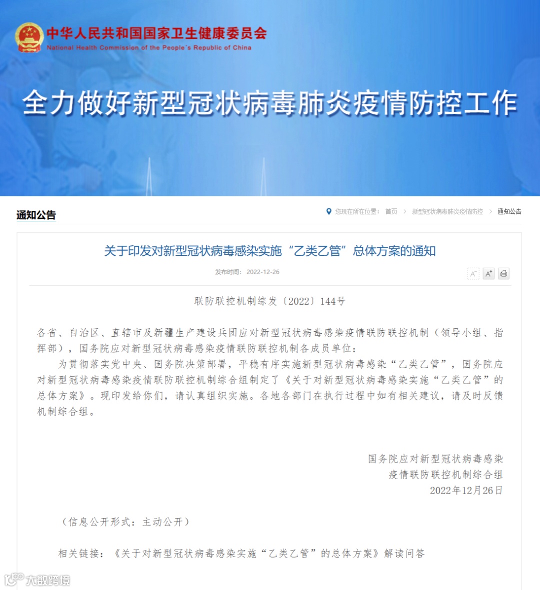 《关于对新型冠状病毒感染实施“乙类乙管”的总体方案》其中提出优化中外人员往来管理。
