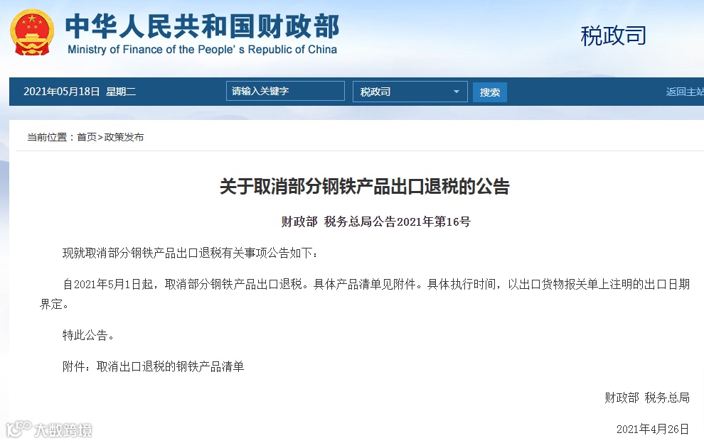 为了弥补国内粗钢产量下滑带来的供给缺口,我国自5月1日起取消部分钢材品种的出口退税政策。中国国内一年出口6000-7000万吨钢材,取消出口退税,将导致一大半钢材回流国内,或给钢材市场降温。