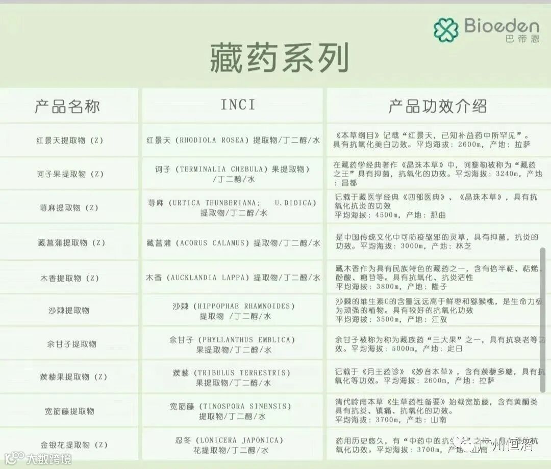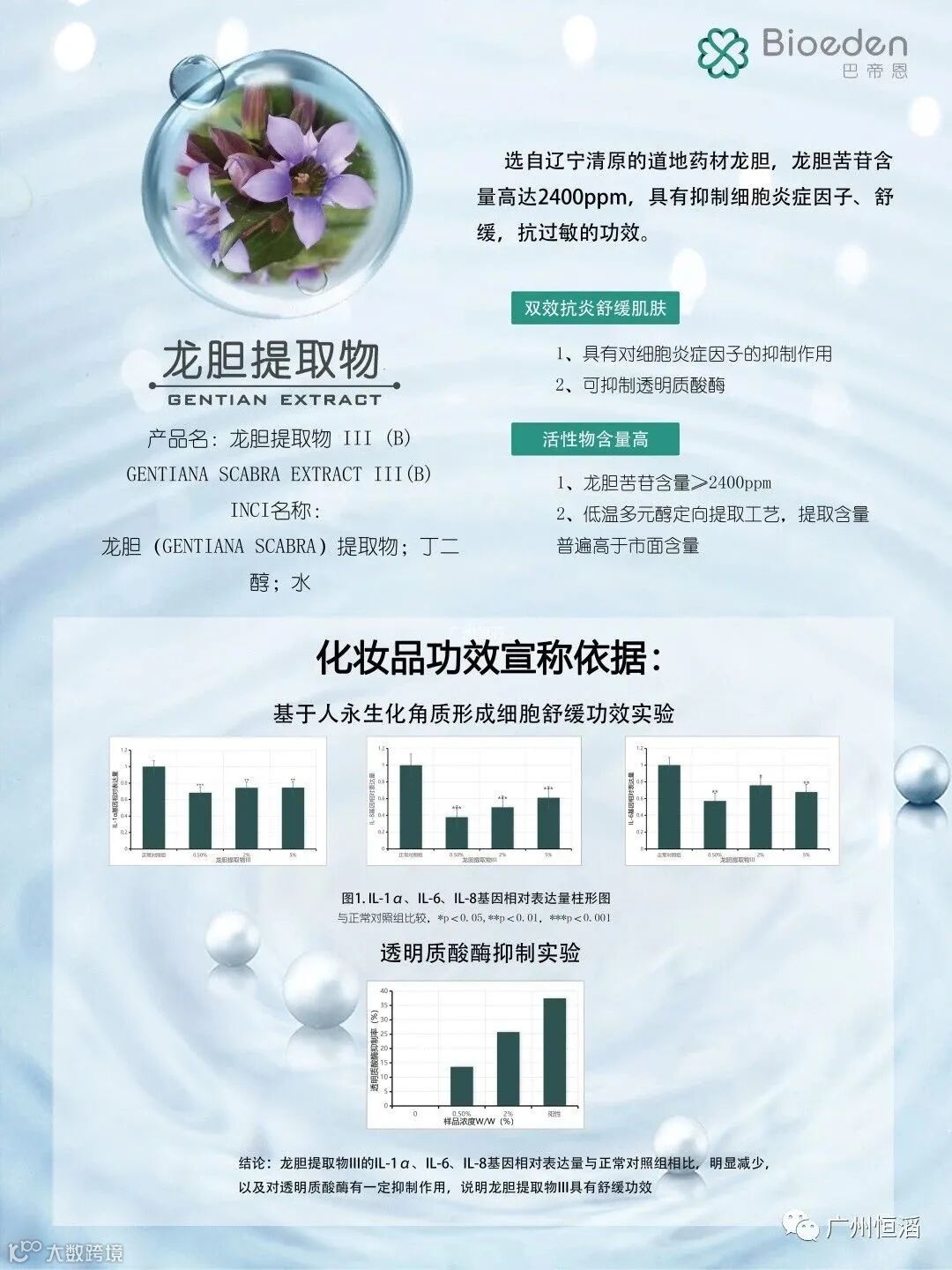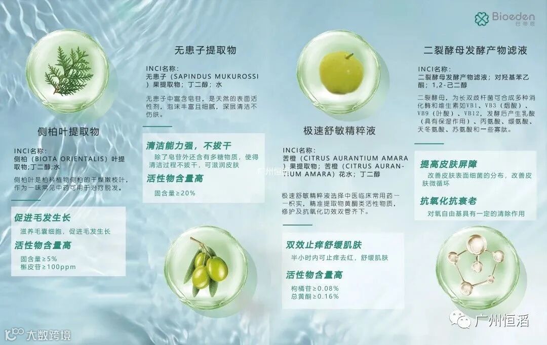 巴帝恩top 5 明星产品:龙胆提取物、侧柏叶提取物、无患子提取物、极速舒敏精粹液、二裂酵母发酵产物滤液。
