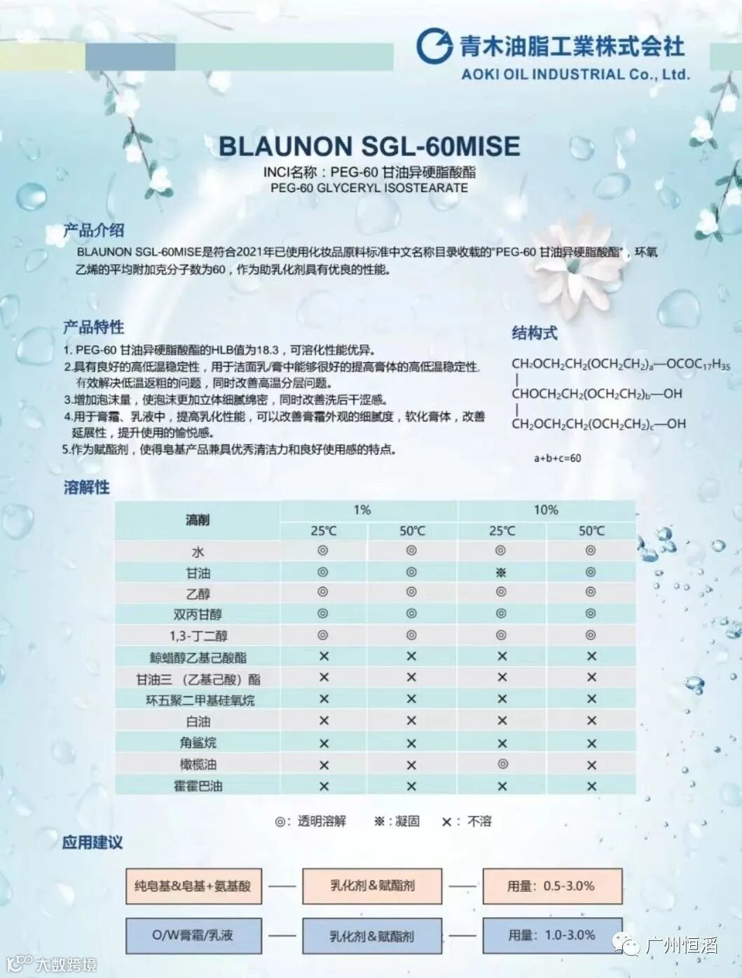 日本青木油脂株式会社一直以独有的技术专注于开发聚氧乙烯,聚氧丙烯的诱导体产品。近年,表面活性剂化学有了长足的发展,对表面活性剂的多功能化也提出了更高的要求。
