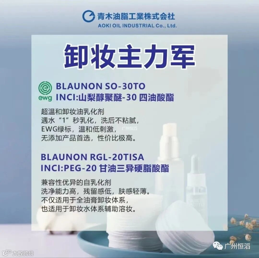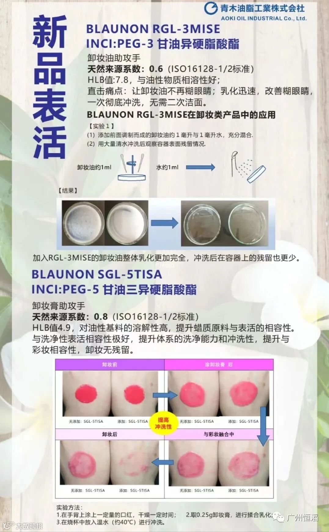 此次展会,日本青木除了主推卸妆表活BLAUNON SO-30TO、RGL-20TISA、RGL-20TISE、RGL-7YOU、RGL-3MISE、SGL-5TISA、RGL-8MISE;还展出了OMG系列等的肤感调节剂以及增溶剂系列等。