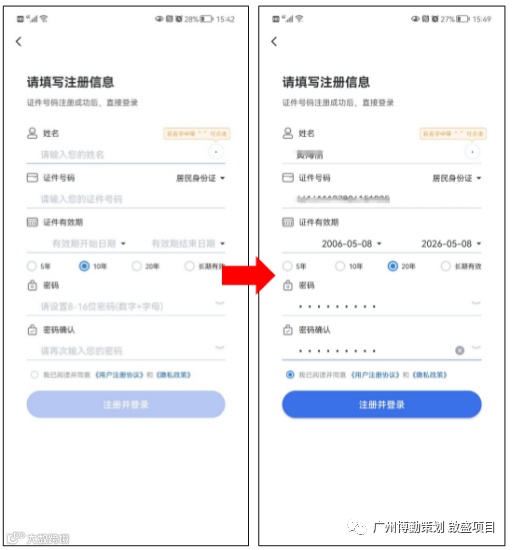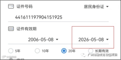 1、身份证有效期:先选期限,有效期从后面截止日先填,前面的起始日会自动跳出来。