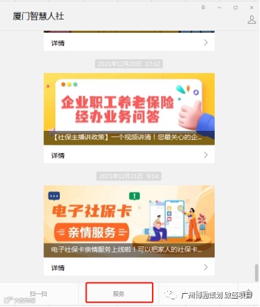第一步:关注微信公众号 “厦门智慧人社”,点击下方菜单“服务”