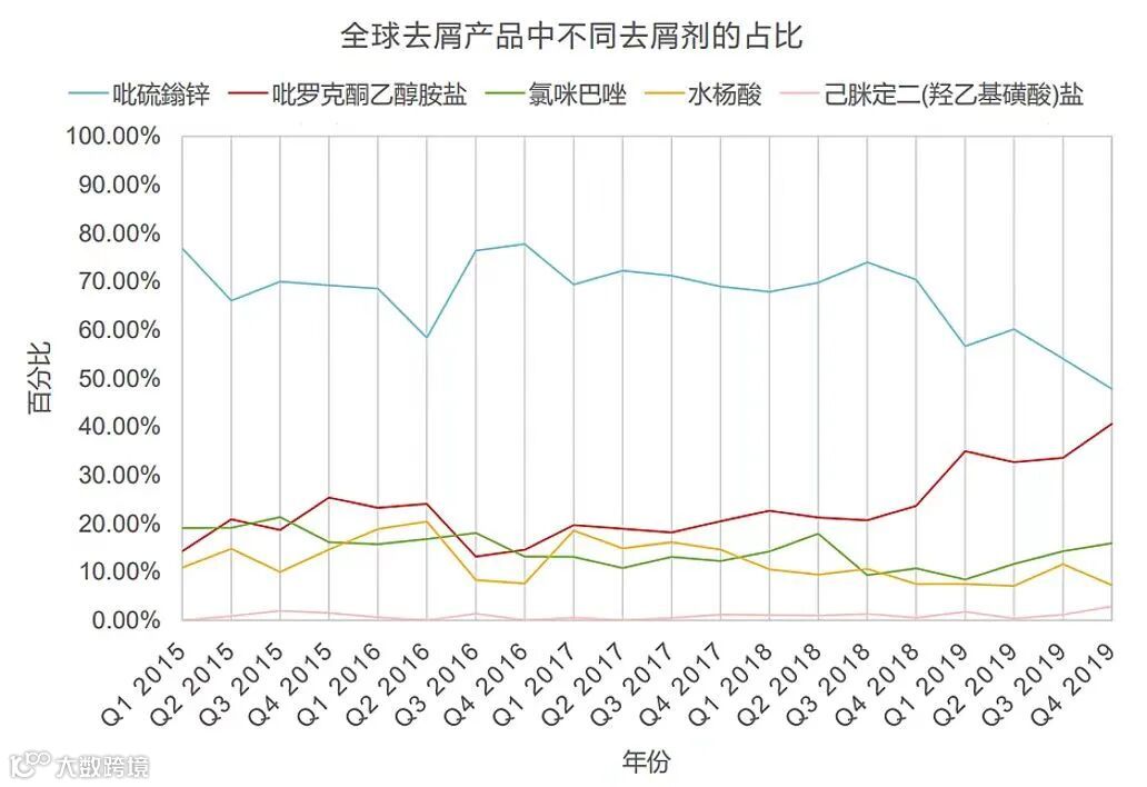 全球去屑产品中主要的去屑剂是:吡硫翁锌(ZPT)、吡罗克酮乙醇胺盐(OCT)、氯咪巴唑、水杨酸、己脒定二(羟乙基磺酸)盐。