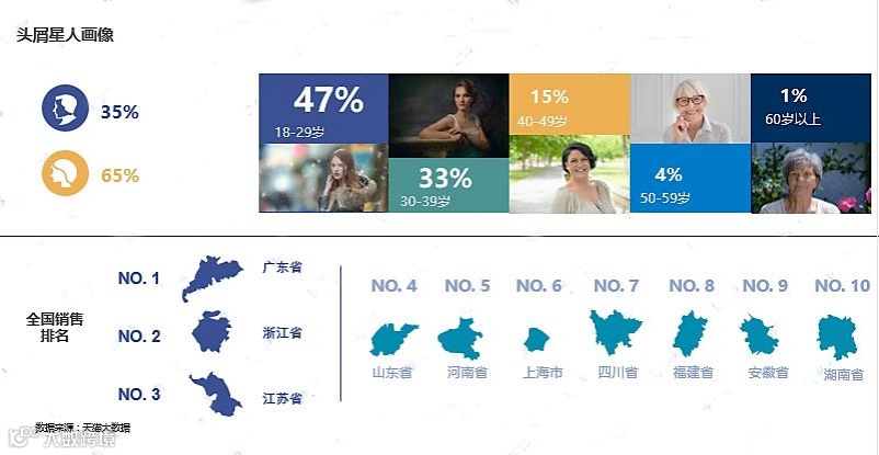 去屑是困扰全民的难题,头屑星人涵盖男女老少,分布大江南北。19-29岁的精致青年占据了头屑星人的半壁江山,65%购买去屑洗发水的都是集美(女性)。购买去屑洗发水的头屑星人所在省份Top10聚集在中部和东南沿海等气候相对温暖湿润的地区,广东、浙江、江苏是“头”等问题的大户。