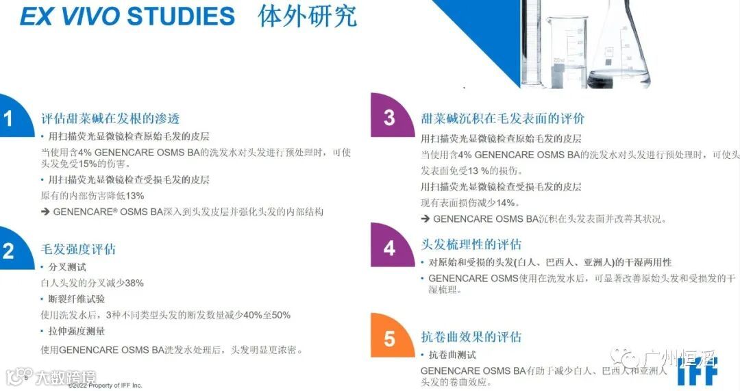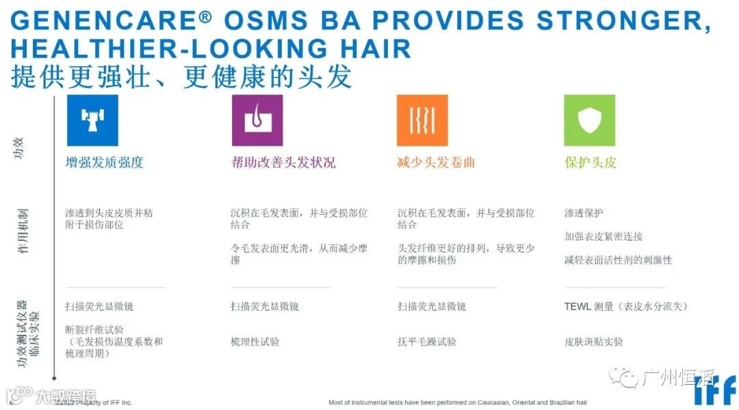 IFF的 GENENCARE®OSMS BA 能沉积在头发表面,改善头发表面状况和减少表面损伤。