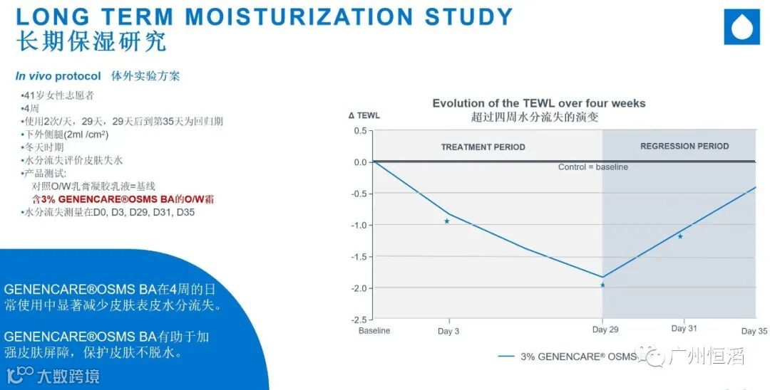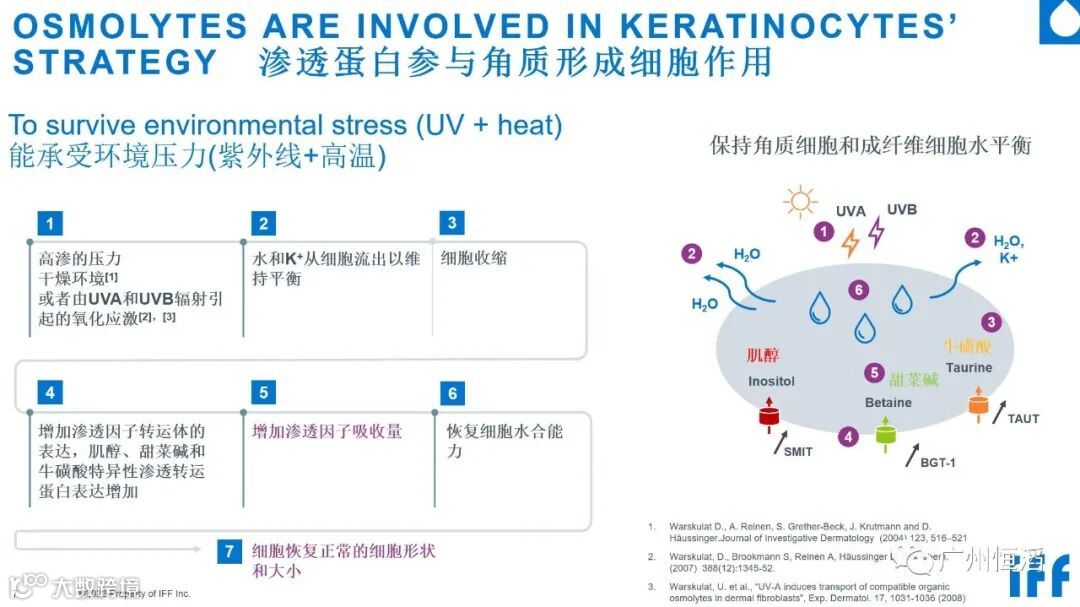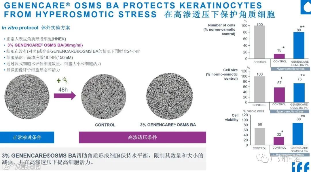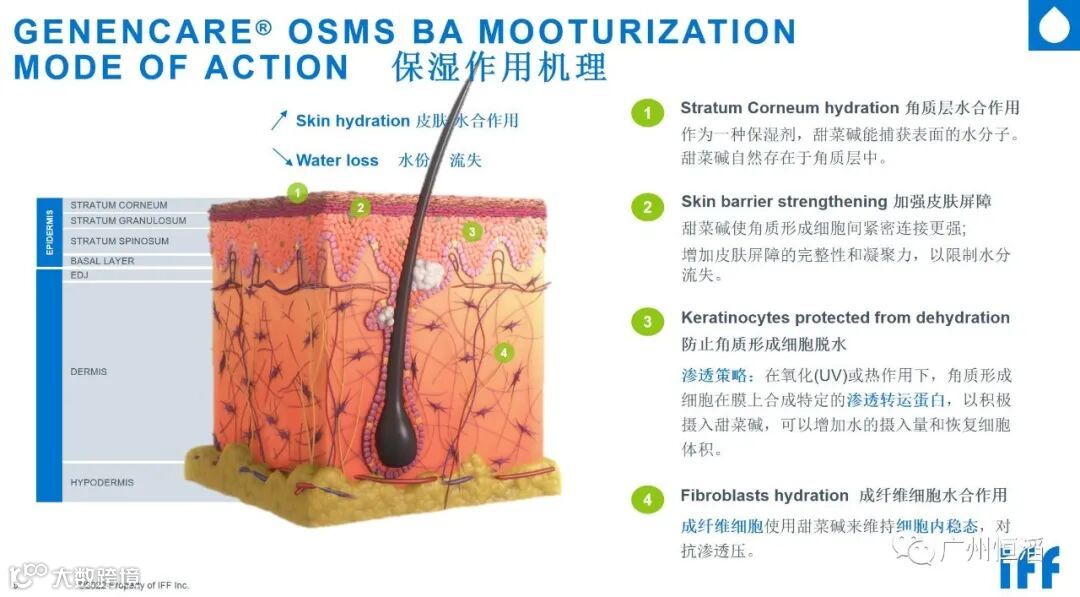 GENENECARE® OSMS BA 是一种天然保湿因子,在氧化(UV)或热作用下,角质形成细胞在膜上合成特定的渗透转运蛋白,以积极摄入甜菜碱,可以增加水的摄入量和恢复细胞体积,有助于角质形成细胞管理水分平衡,并保护角质形成细胞免受高渗透压。
