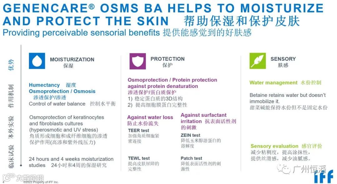 1、GENENCARE® OSMS BA是一种从甜菜根中提取的高纯度无水甜菜碱,提取于天然甜菜根,100%天然来源,循环回收原料,符合纯净美妆和可持续发展的趋势。