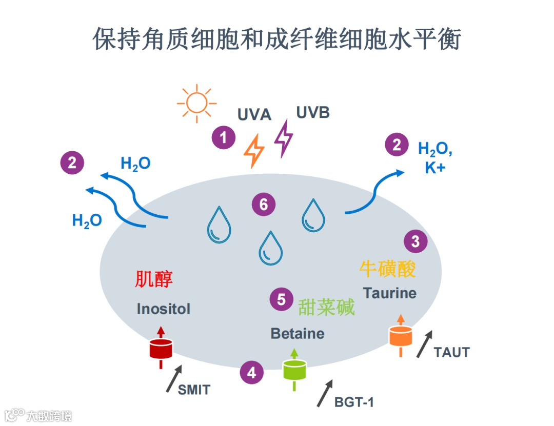 促进角质细胞分化。增加中间丝相关蛋白表达,NMF前体;增加成纤维细胞线粒体呼吸;促进成纤维细胞新陈代谢,增加能量 (ATP) 产生和蛋白质含量;通过增加有机渗透调节物质转运蛋白来调节细胞水平衡;保护角质细胞免受干燥 /高渗压力。