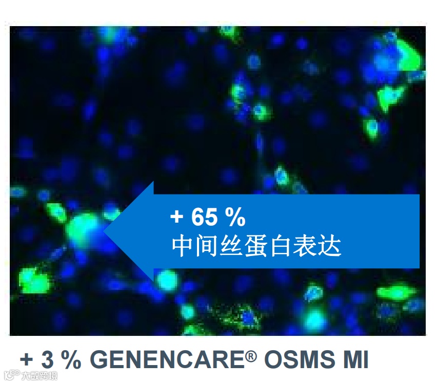 GENENCARE®OSMS MI增加一种皮肤干细胞生长因子(PDGF-BB) 的产生;GENENCARE®OSMS MI是角质细胞生长所需的营养物质,有助于角质细胞的中间丝蛋白表达增加,促进角质细胞的新陈代谢;改善真皮成纤维细胞和人内皮细胞的代谢和生长;GENENCARE®OSMS MI 保护角质细胞免受高渗压力。