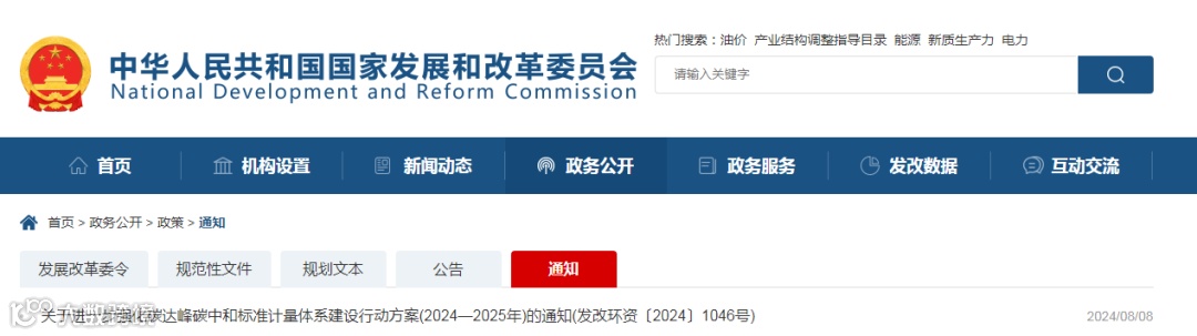 8月8日,国家发展改革委、市场监管总局、生态环境部发布关于进一步强化碳达峰碳中和标准计量体系建设行动方案(2024-2025年)的通知。
