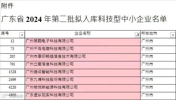 广东省科学技术厅关于广东省2024年第二批拟入库科技型中小企业名单已公示,园区视翰科技、千鸟互联、享印技术、立趣科技、接点智能、九博科技、格悦科技、燧光共8家谷友企业成功通过认定。