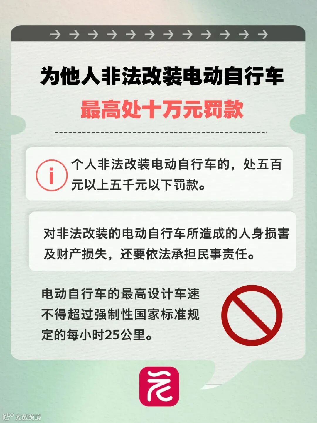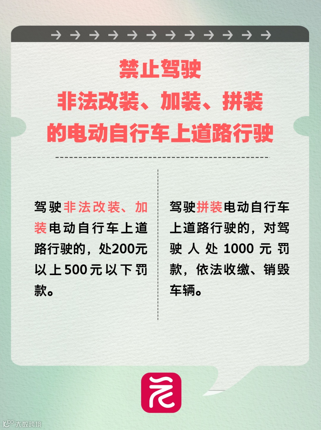 禁止任何单位和个人编发以及传播非法改装、加装、拼装电动自行车信息。