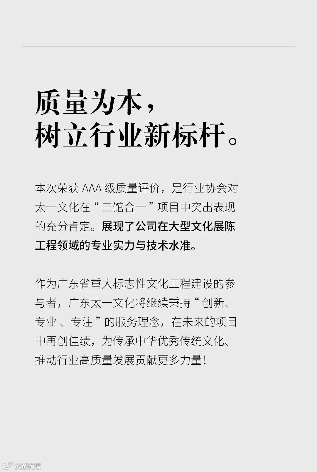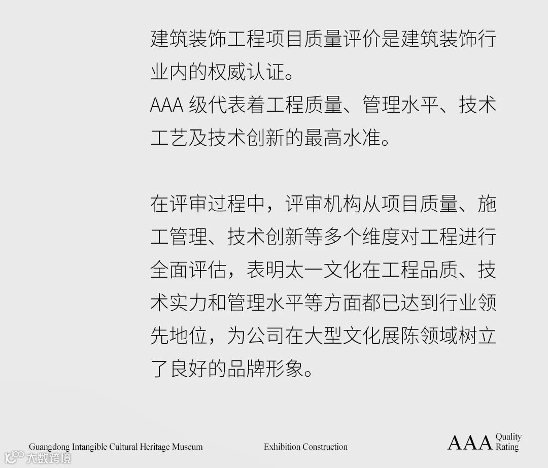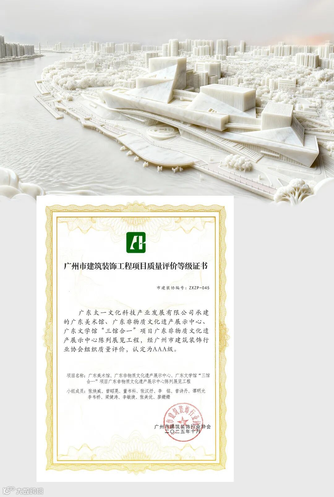 导读:近日,经广州市建筑装饰行业协会组织质量评价,广东太一文化科技产业发展有限公司承建的广东非物质文化遗产展示中心陈列展览工程被认定为AAA级质量等级。这一荣誉是对我司在展陈工程领域专业实力和卓越品质的高度