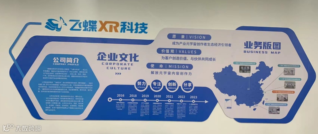 提供商,公司自主研发的“飞蝶灵创”作为元宇宙新基建底层工具,已在数字教育、数字文旅、数字企服、数字政务等领域深度应用,公司先后获得了国家高新技术企业、瞪羚企业、2022年度中国AIGC TOP10科技创新企业等荣誉资质;以及世界AWE虚拟现实最佳产品奖、国际虚拟现实创新创业大赛二等奖等数十项荣誉大奖;拥有自主知识产权近100项(包含18项发明