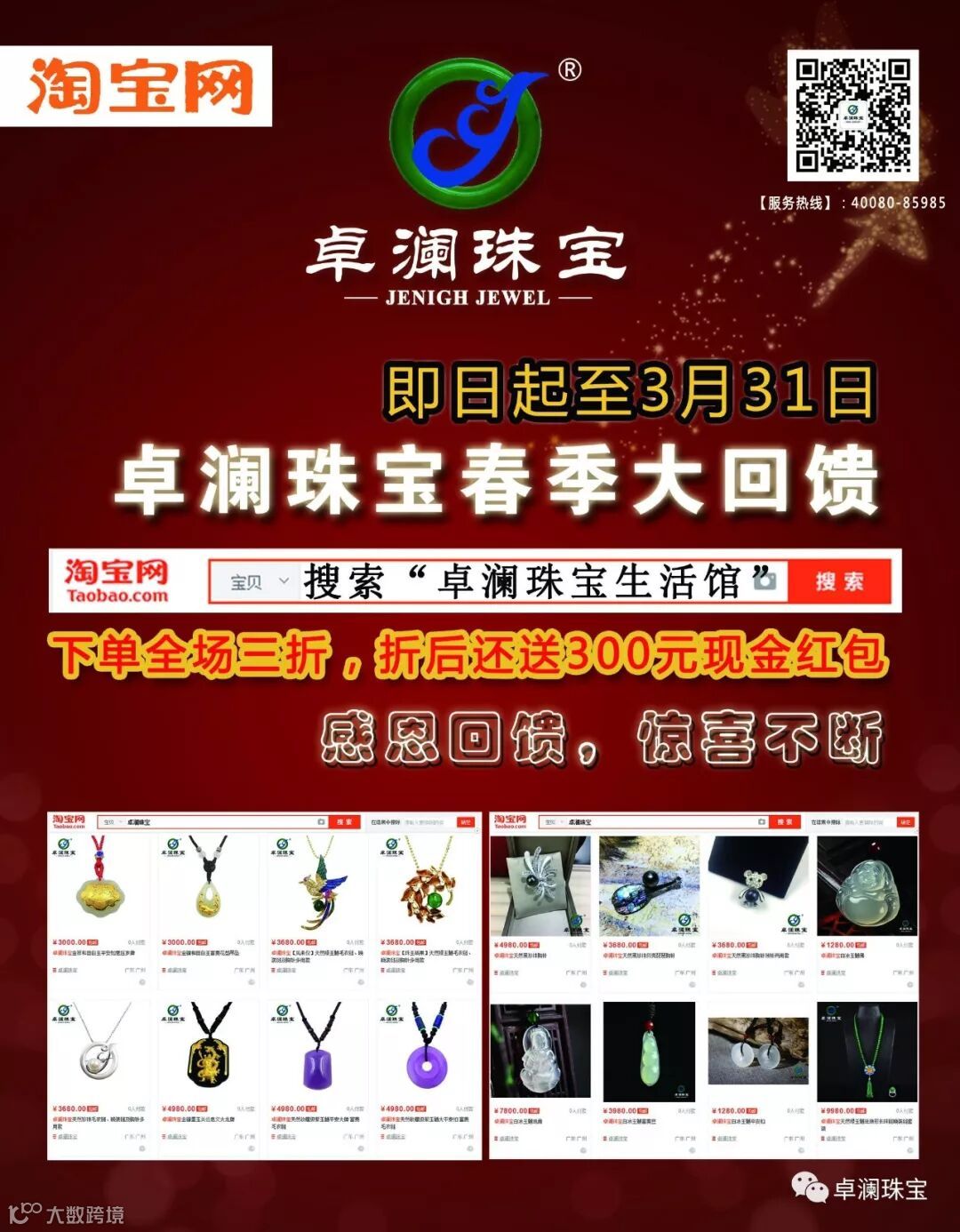 即日起至3月31日在淘宝搜索“卓澜珠宝生活馆”下单全场三折,折后还送300元微信红包