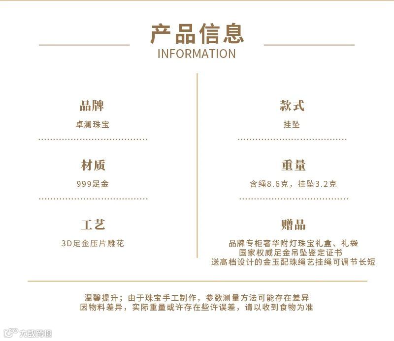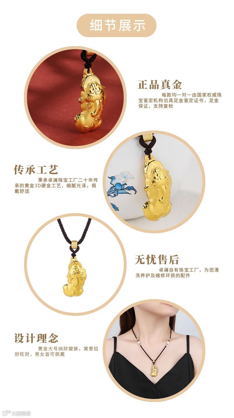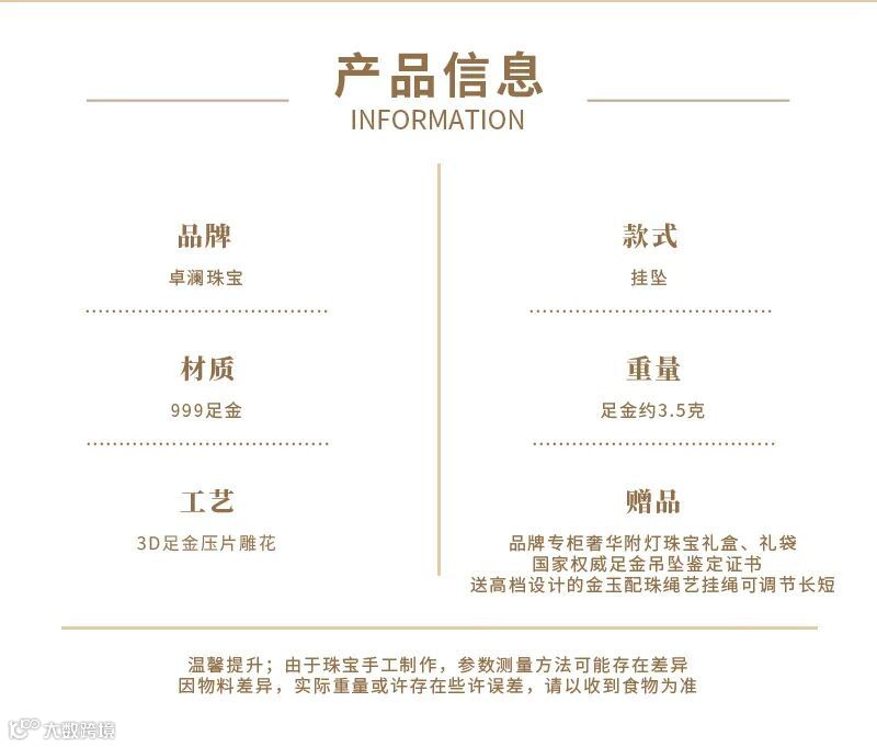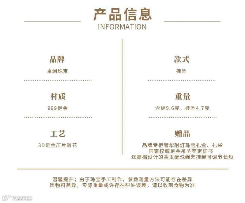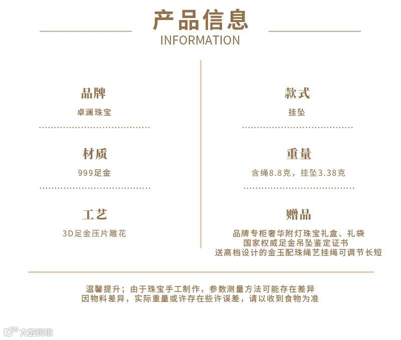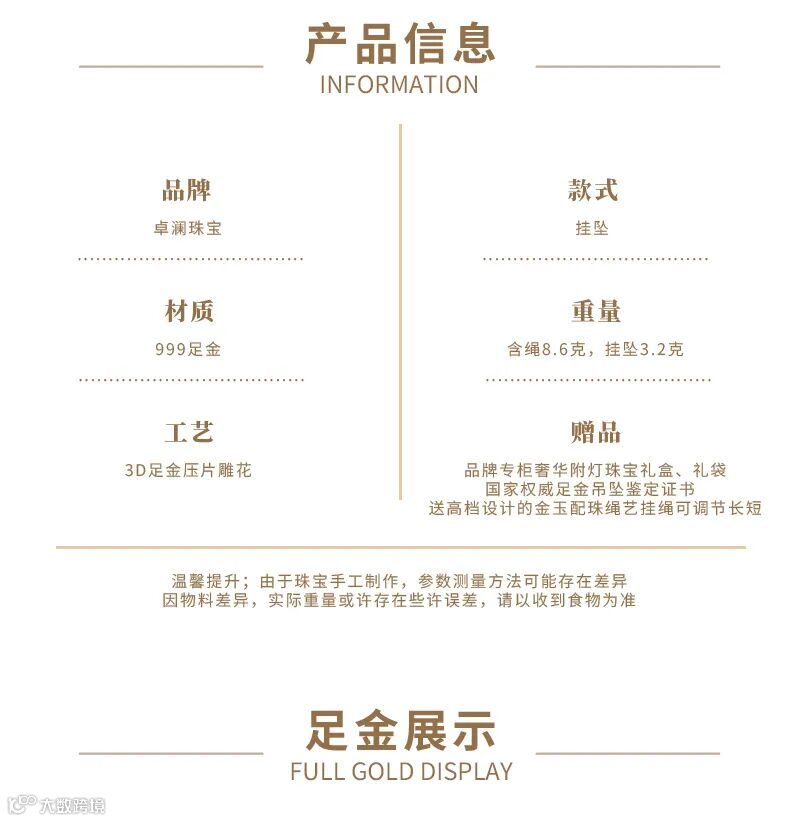 卓澜珠宝999足金黄金吊坠男士