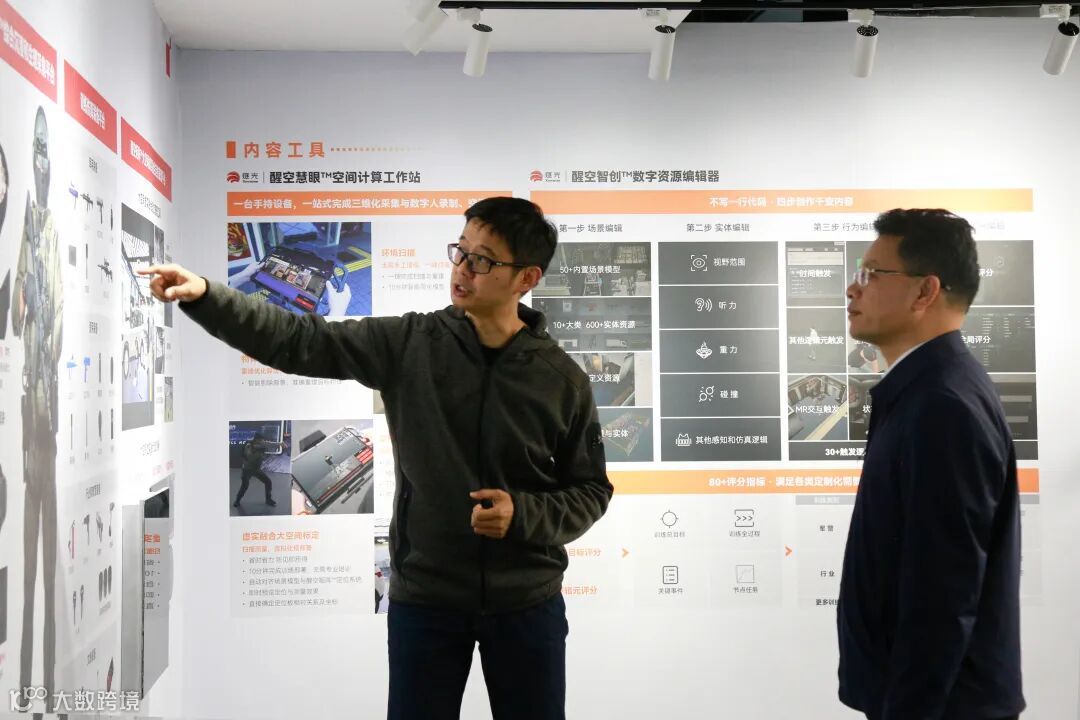 在燧光,创始人贺杰向黄卫平厅长详细地介绍了企业在硬件载体、内容工具和平台训练上的研发和应用。黄厅长提到,广西地区也有众多退役军人创办的企业以及一些国防教育基地存在类似合作需求,未来可以积极引荐这些企业与燧光加强合作与交流,共同探索高质量发展之路。