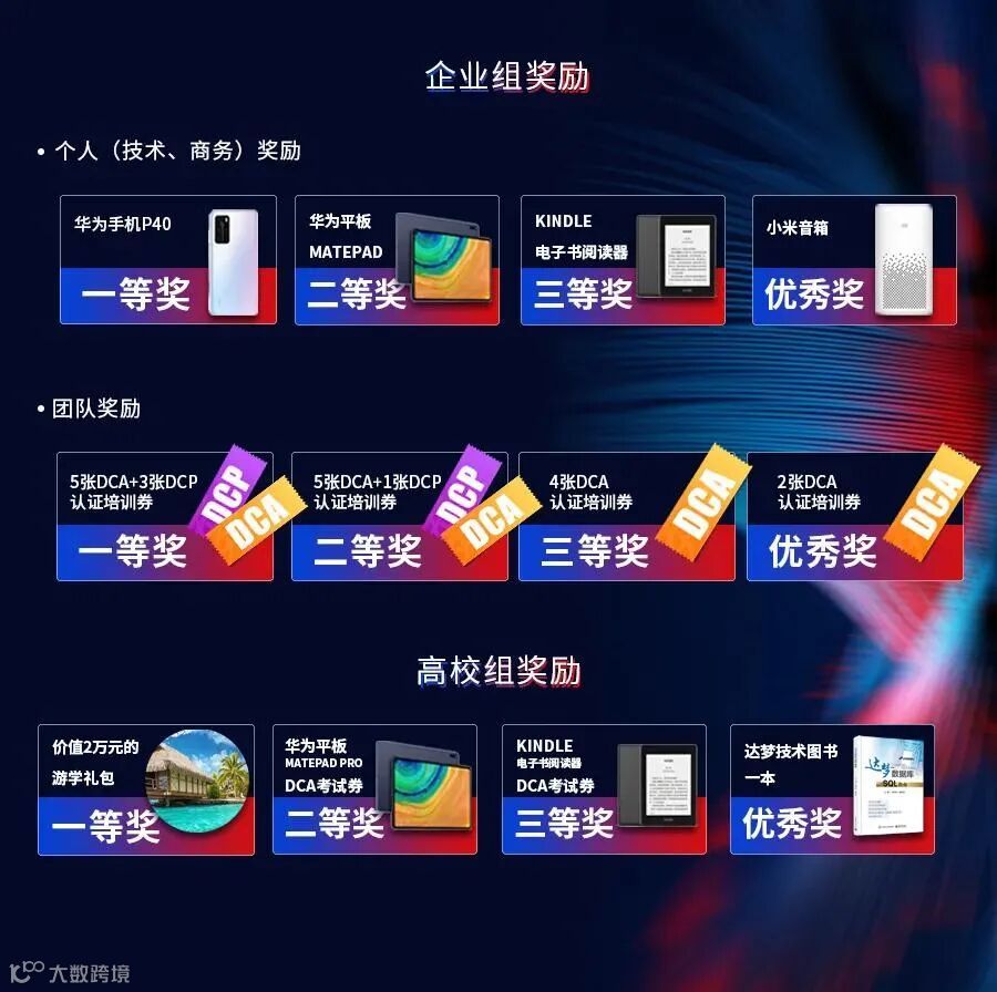 大赛为参赛选手准备了丰厚的奖品,各类奖品数量达到200余项。大赛不仅为获奖主体准备了各类科技好礼,价值上万的游学大礼包,畅享海岛多日游,而且,凡参与比赛的主体均有机会获得达梦大学免费提供的数量不等的认证培训券,参与决赛颁奖典礼并获得企业实习和工作推荐的机会。