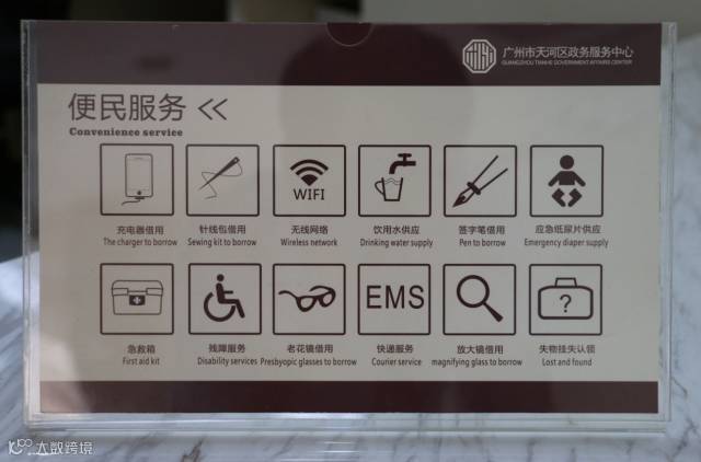 天河区政务服务中心在办事大厅设置舒适的群众等候区,配备冷热饮用水、公共WIFI、婴儿尿片、急救箱、老花镜、专用轮椅等便民服务设备,营造良好舒适的政务服务环境。