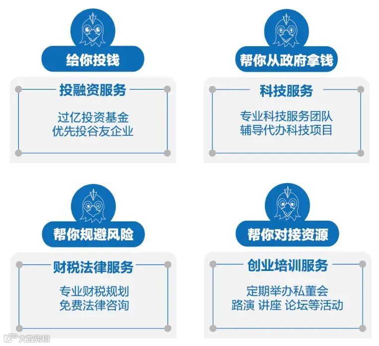 投融资服务、人力资源服务、技术支撑服务、科技服务、创业培训服务、导师服务、财税法律服务、商事综合服务