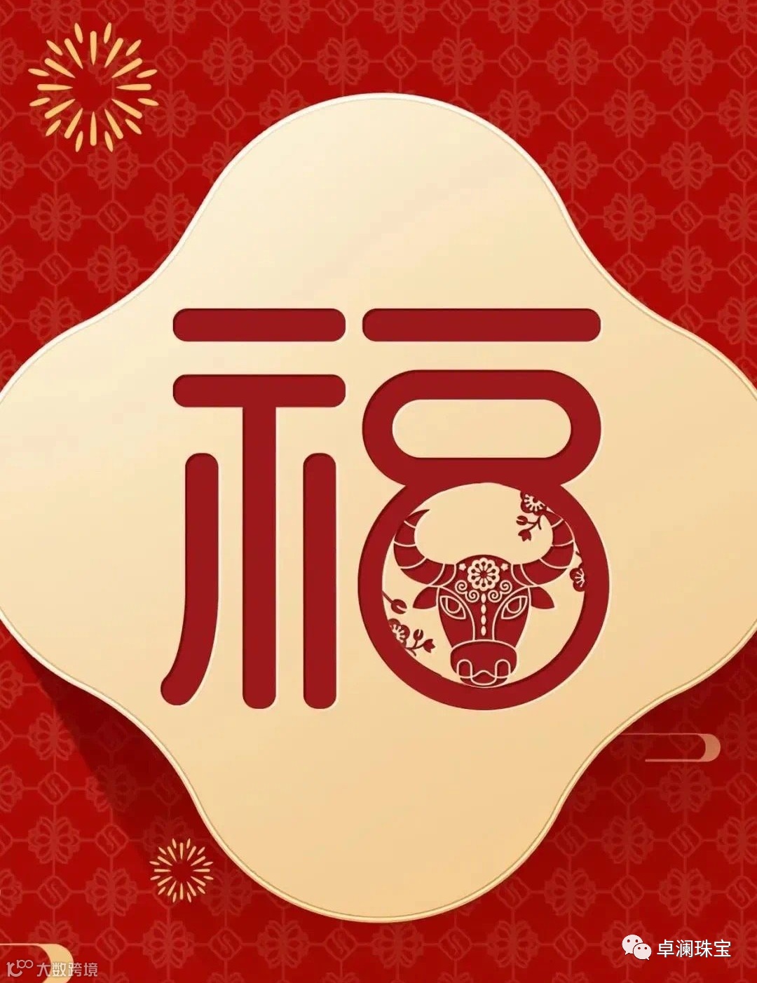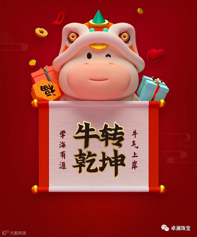回首过去,卓澜珠宝与您,经历了不平凡的一年,一年的耕作,一年的汗水,一年的成就,回首一年的点滴,展望更加辉煌的一年,卓澜珠宝祝您,开工大吉,牛年吉祥,牛转乾坤。