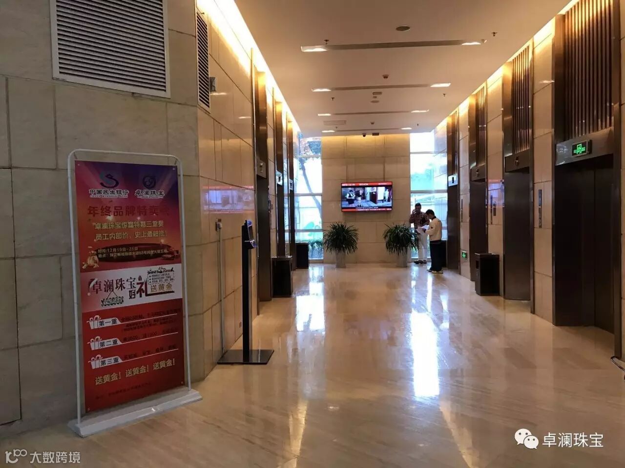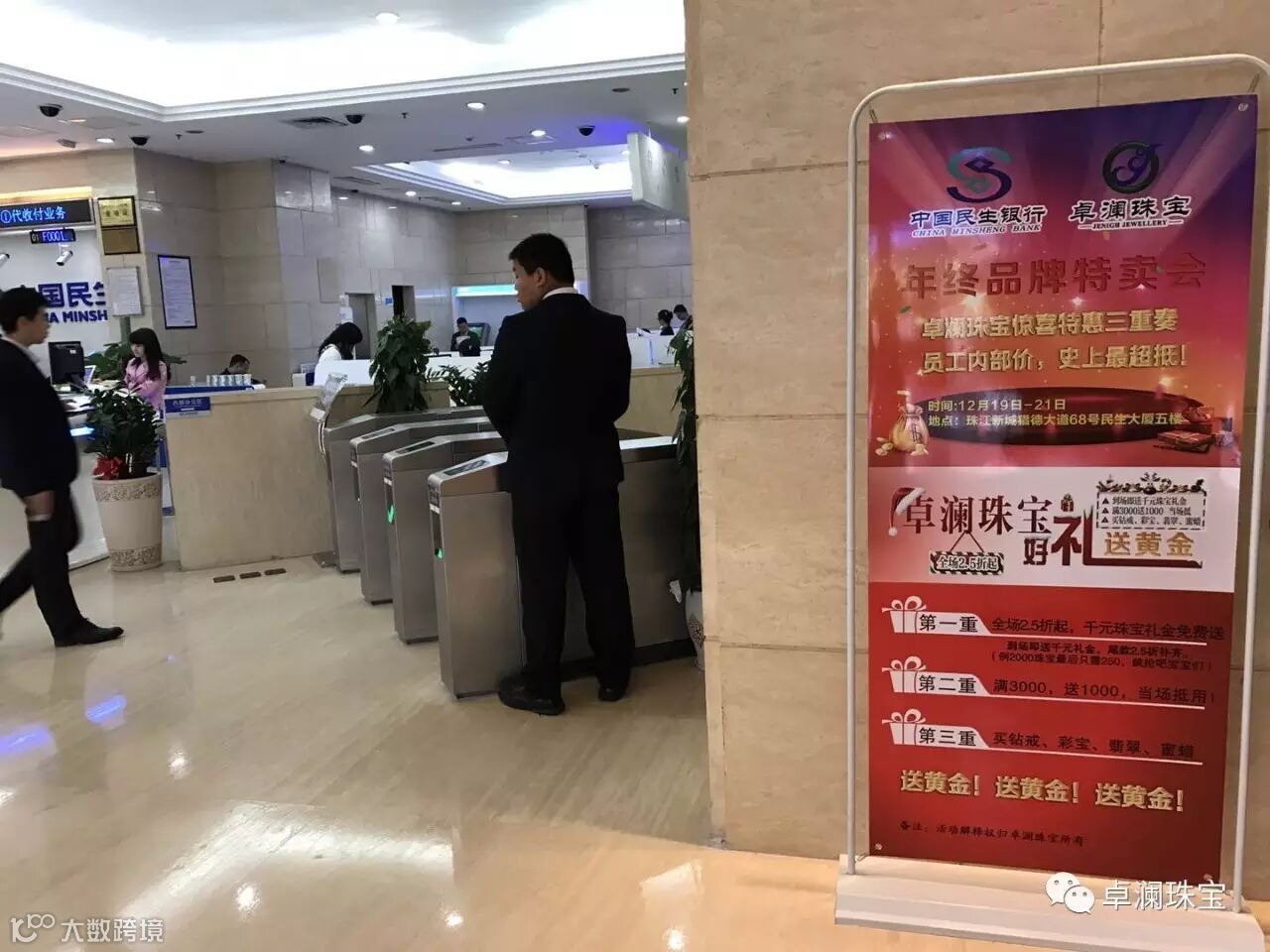 品牌特卖会期间,进入民生银行总行营业部的大堂,即可看到醒目的卓澜珠宝品牌宣传。