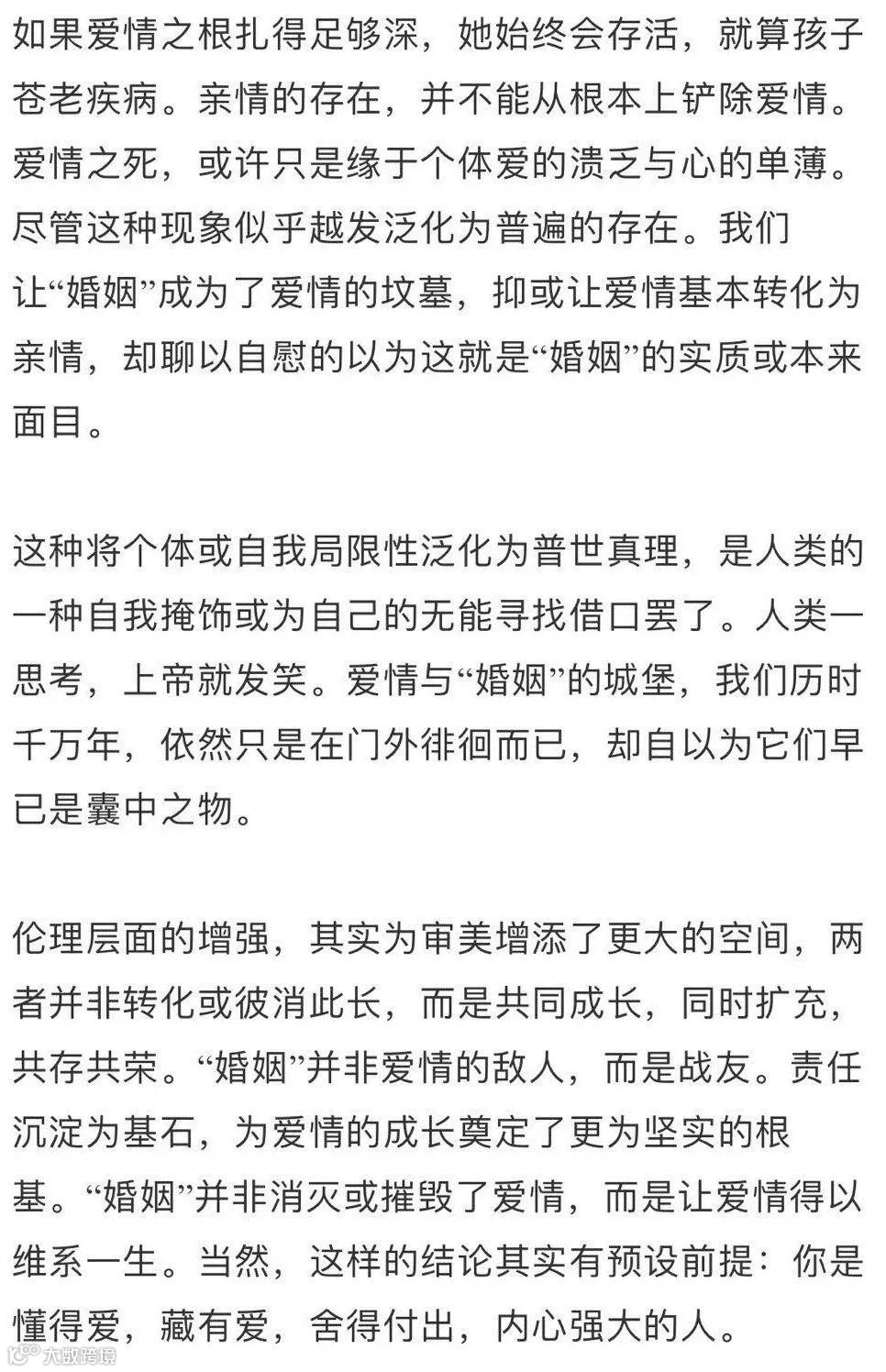 本文中的“婚姻”,并非完全法律意义上,包括近乎婚姻的患难与共的长期伴侣(长久相守)。“婚姻”的内核就(应)是奠基于精神契合之上的伴侣,只强调物质层面门当户对或利益互换的世俗婚姻,应该是寿终正寝之时。