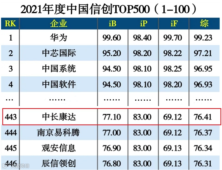 中国科学院主管权威媒体《互联网周刊》、德本咨询联合发布“2021年度中国信创TOP500”榜单,中长康达凭借卓越的技术研发能力、完善的产品服务及创新的解决方案,再次入选,相较上一年,排名上升33位。