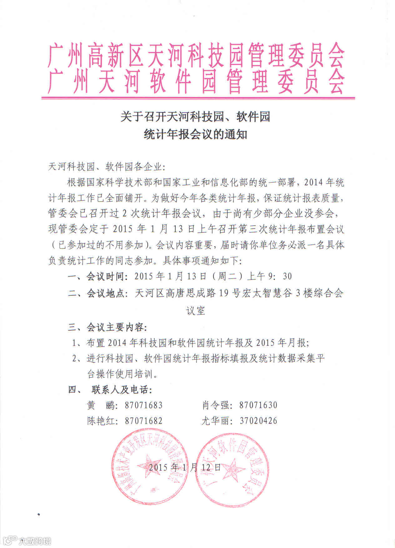 【活动通知】关于召开天河科技园、软件园统计年报会议的通知