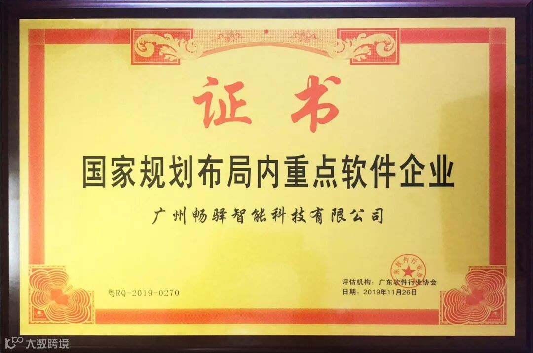 畅驿智能符合国务院印发的《进一步鼓励软件产业和集成电路产业发展的若干政策》和《软件企业评估标准》(T/SIA002-2017)的有关规定,经国税总局及广东软件行业协会评估,被认定为“国家规划布局内重点软件企业”。获得该项资质认定,代表了国家对畅驿智能在产研发展创新方面的认可与鼓励。