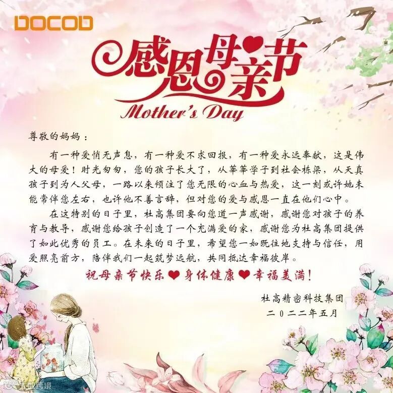 每年五月的第二个星期天是母亲节,杜高都会在五一为员工的妈妈们,呈上最真挚的祝福!希望员工们在五一的时候,能将这份祝福,亲手交由母亲!