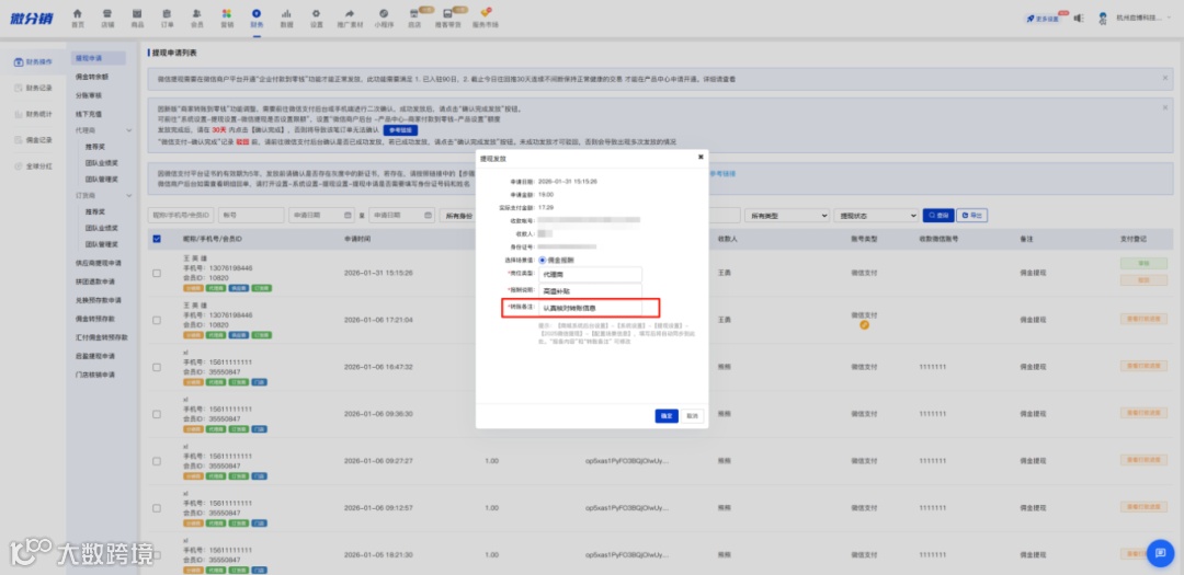 新版微信提现审核时填写的转账备注支持提现申请和提现记录导出