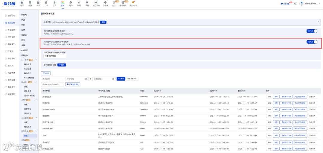排队免单活动新增运费是否参与免单设置;开启后贡献金额和返单金额比例包含运费