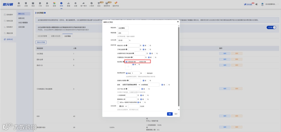 分红等级升级条件中的指定商品可设置订单交易状态条件,默认交易完成