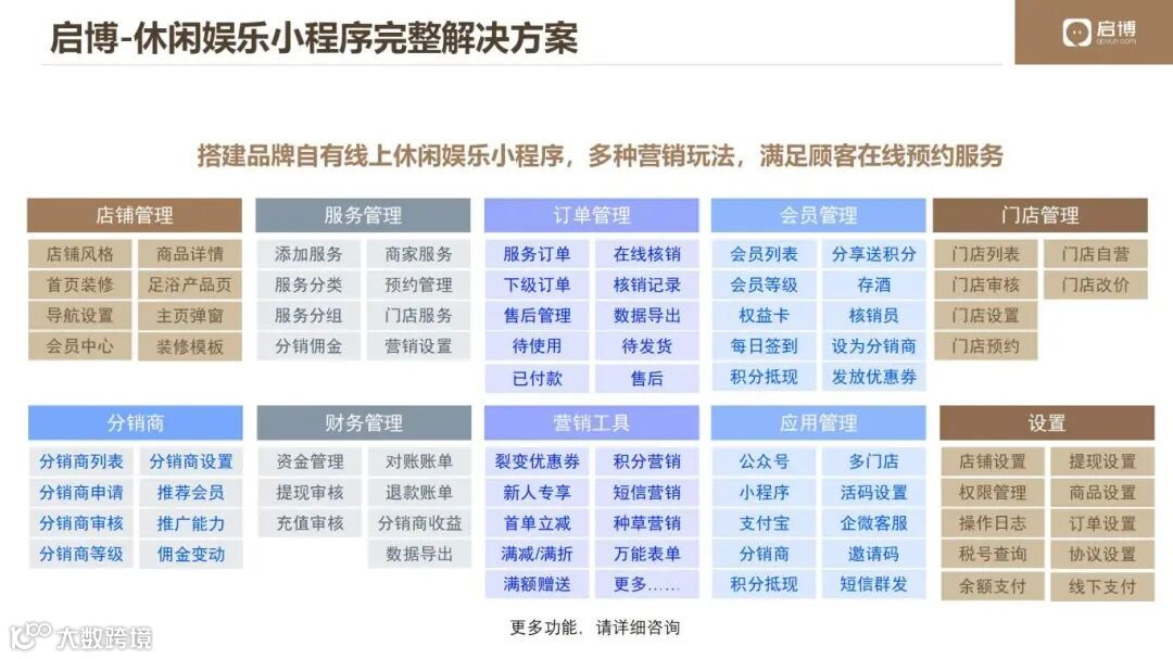 通过持续的升级迭代,启博云目前已上线覆盖本地生活多业务场景的解决方案,包括餐饮、休闲娱乐、旅游、民宿、美容美甲等,涵盖了门店数字化、导购数字化、营销数字化、管理数字化、会员数字化、线上线下打通等多个维度,为连锁企业的数字化转型提供了全面支持。