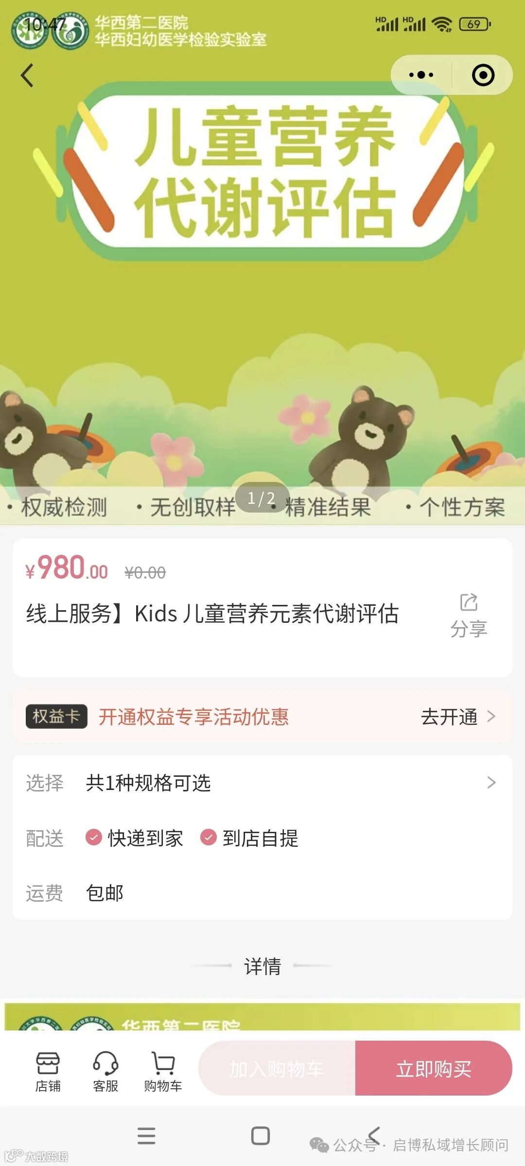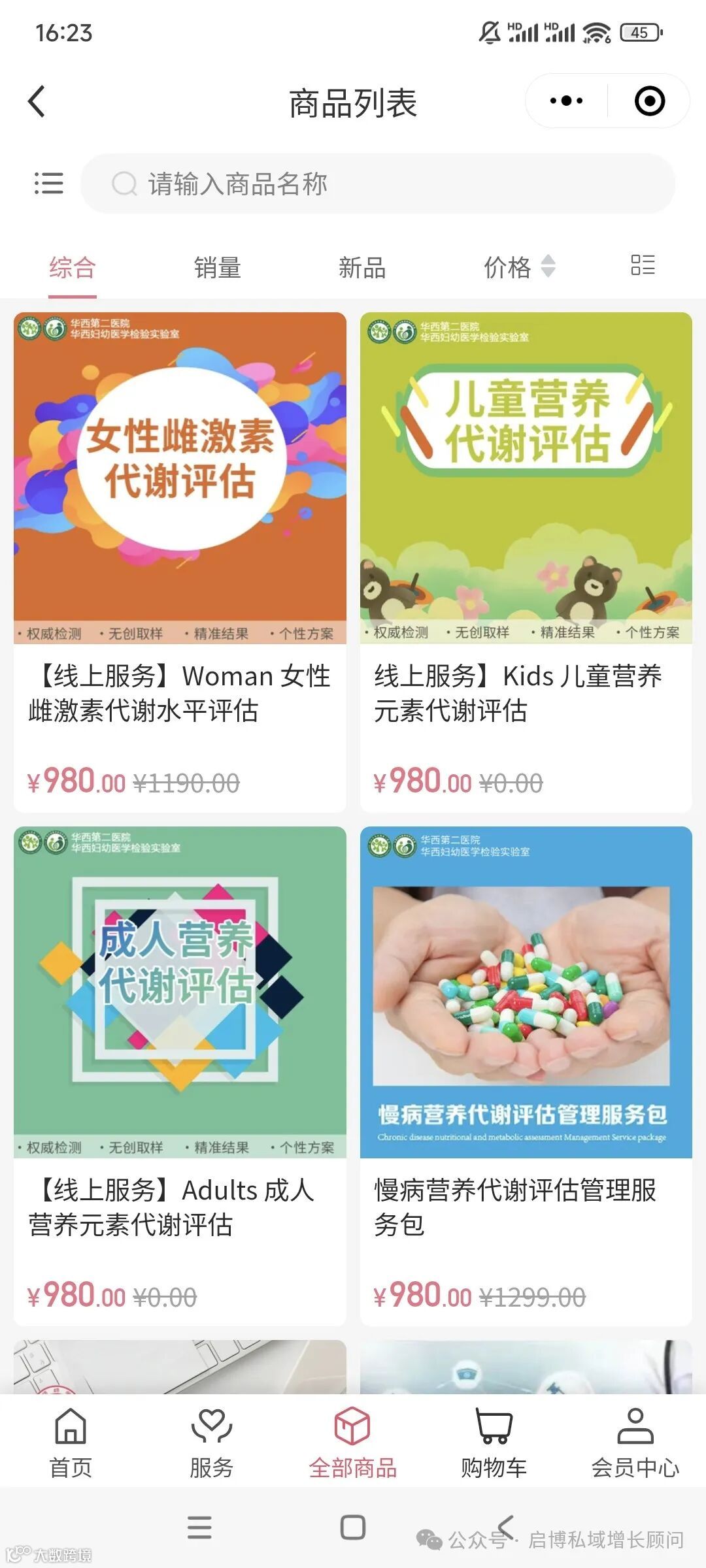 全部商品板块,用户可以直接找到女性雌激素代谢水平评估、儿童营养元素代谢评估等服务商品,点击进入商品详情页面,了解商品的具体信息、价格等,并轻松完成在线下单购买,方便快捷。
