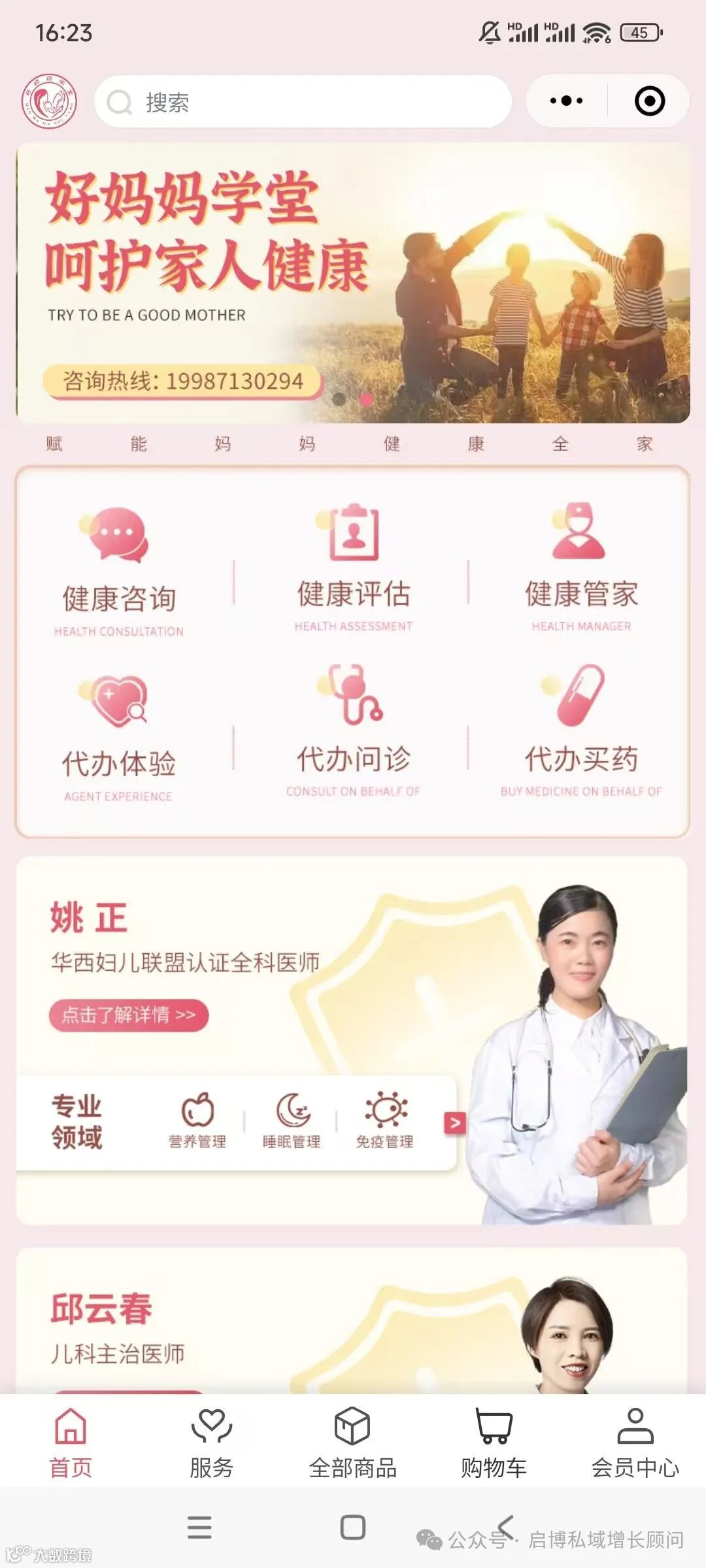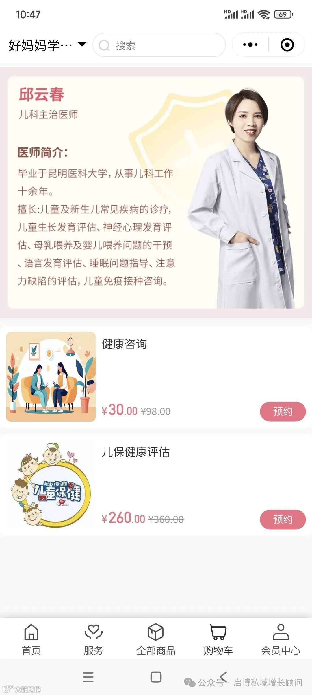 启博深挖好妈妈学堂"全生命周期健康管理"的核心诉求,依托微信生态,为其搭建了一个集服务预约、商品购买、会员管理等功能于一体的线上商城。