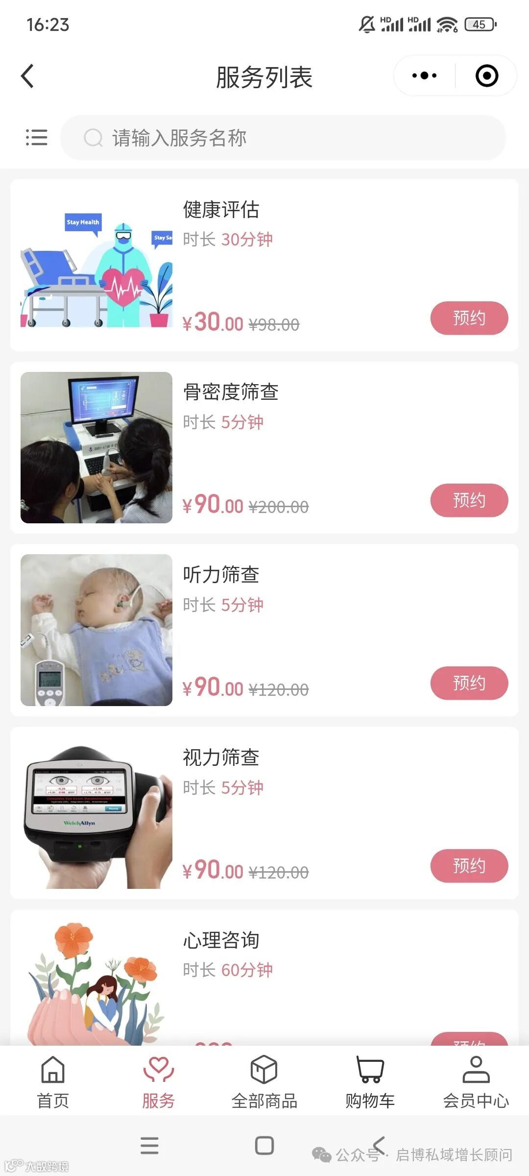 服务板块,平台将健康评估、骨密度筛查、听力筛查等7项核心服务转化为标准化线上产品。用户可自主选择服务日期时段,实时查看医师空闲状态,一键填写电子化健康档案,到店扫码即完成核销并自动获取电子报告,形成"计划-执行-优化"的完整服务闭环。