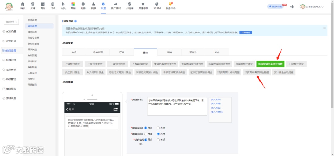 由于这两种消息与模版消息中的【预计佣金提醒】冲突,如若要使用这两项需清空【预计佣金提醒】配置