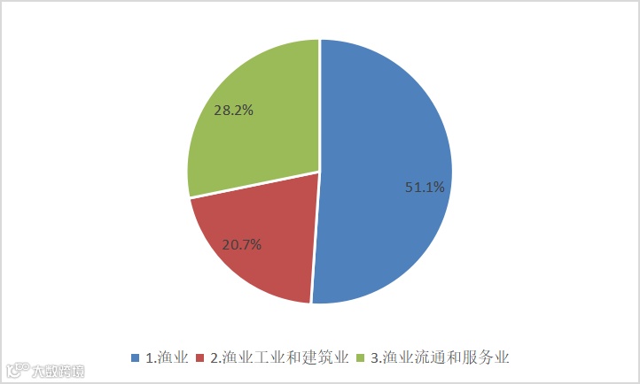 按当年价格计算,全社会渔业经济总产值29689.73亿元,其中渔业产值15158.63亿元,渔业工业和建筑业产值6155.16亿元,渔业流通和服务业产值8375.93亿元,三个产业产值的比例为51.1:20.7:28.2,如图1所示。渔业流通和服务业产值中,休闲渔业产值835.56亿元,同比上升1.19%。