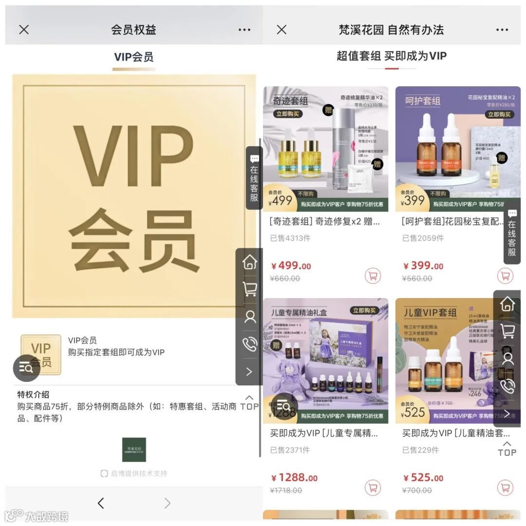 梵溪花园微商城除了通过上线各种促销活动提升商城流量转化外,在微商城内还上架了新人专享优惠商品,用户购买指定礼包即可升级为商城VIP,享受75折优惠,除部分特例商品外(特惠套组、活动商品、配件等),多方式拓客拉新,营造购物氛围带来更多销量。